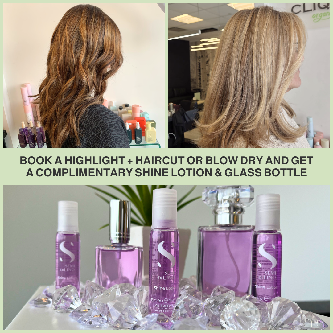 For the month of April, receive a complimentary Semi Di Lino Leave-In Shine Lotion + refillable glass bottle (30mL) when you book a full highlight + haircut or blow dry!